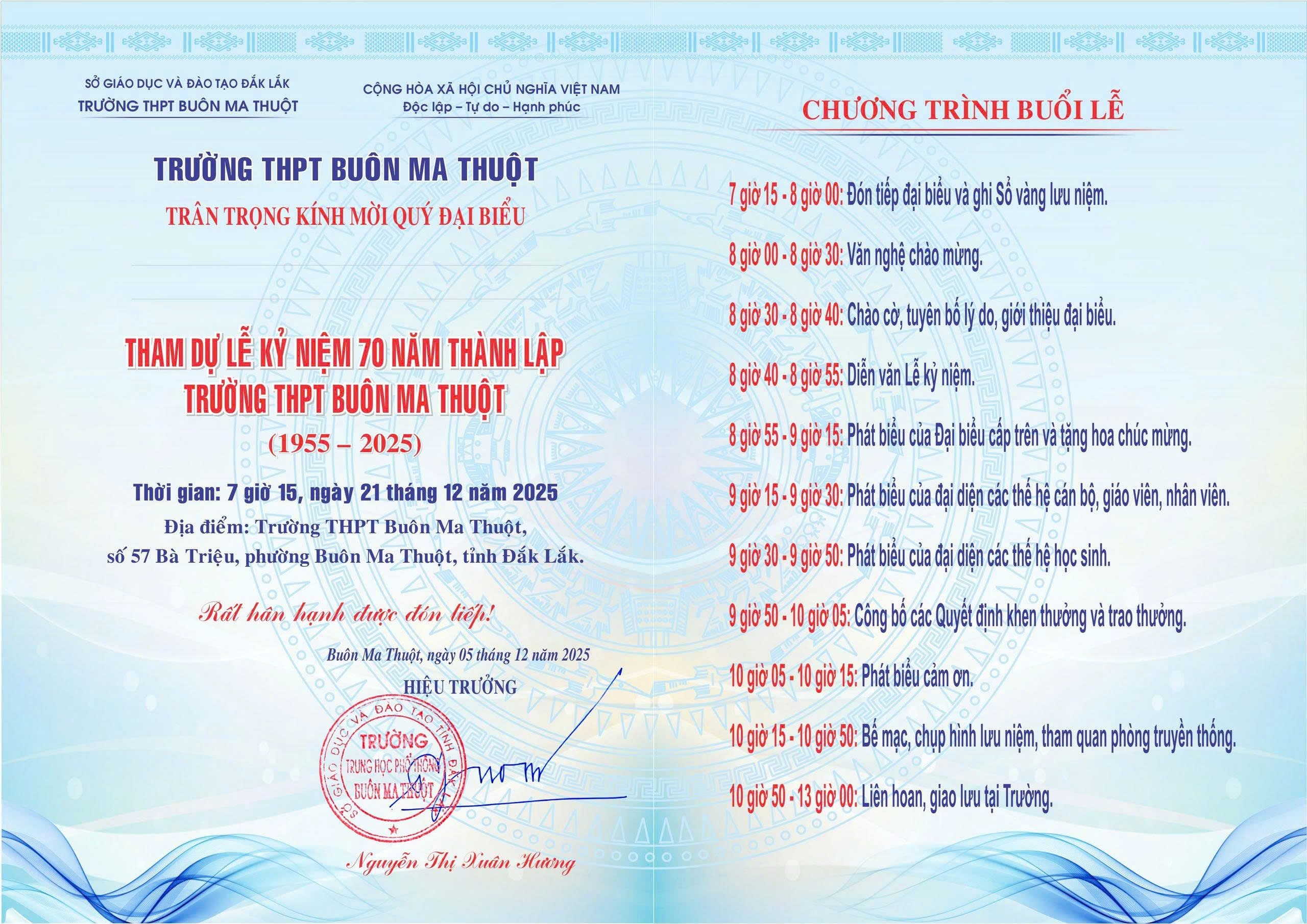 Thư mời tham dự Lễ kỉ niệm 70 năm xây dựng và phát triển Trường THPT Buôn Ma Thuột [1955 – 2025]