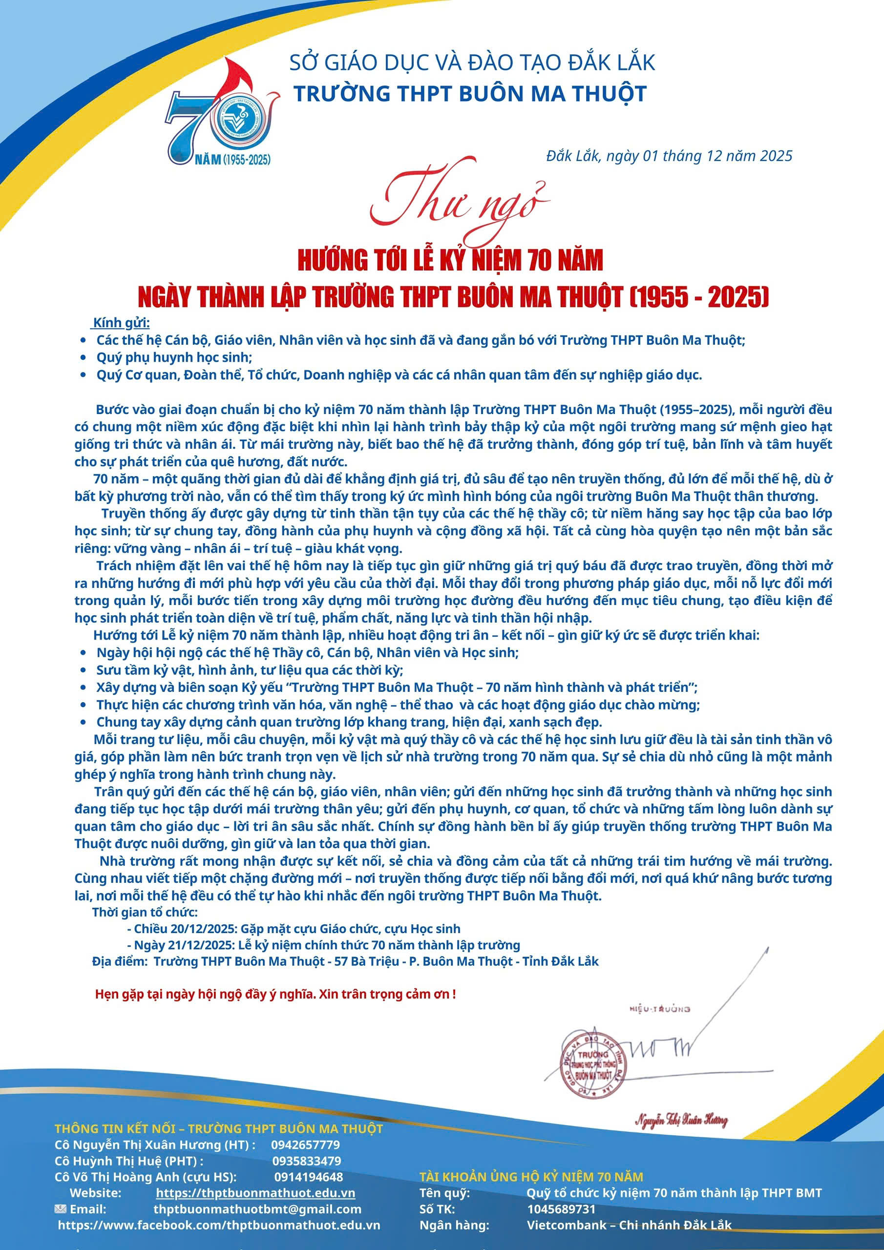 Thư ngỏ hướng tới Lễ kỉ niệm 70 năm ngày thành lập Trường THPT Buôn Ma Thuột